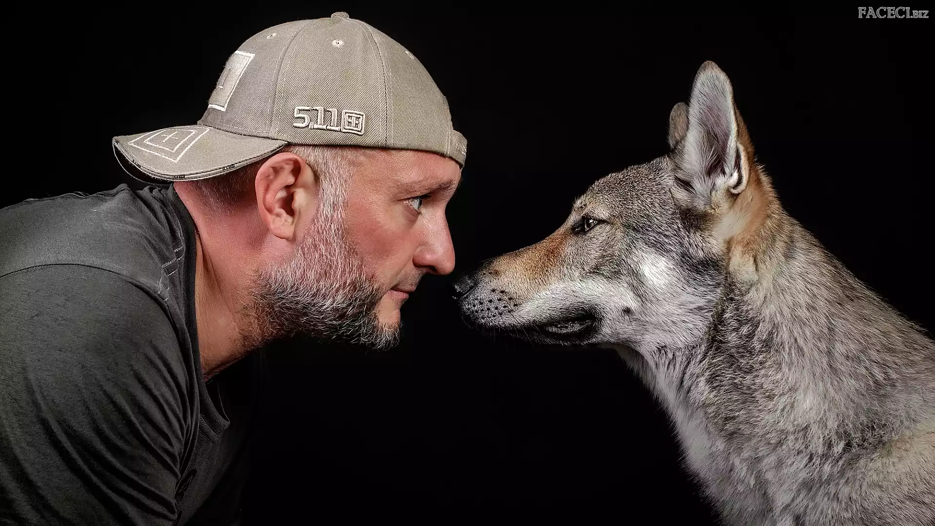 Pies, Tło, Wilczak czechosłowacki, Mężczyzna, Czarne, Profil, Broda, Czapka, Spojrzenie - faceci.biz